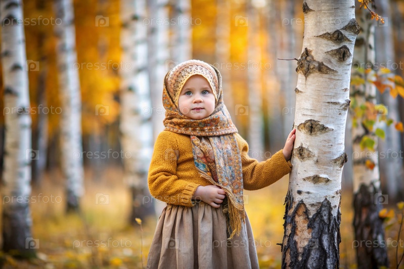 Русские народные традиции.Русский аромат.Красивая девочка в национальном русском платье и шаль в прекрасном березовом роще осенью.Портрет красивой девушки в березном лесу