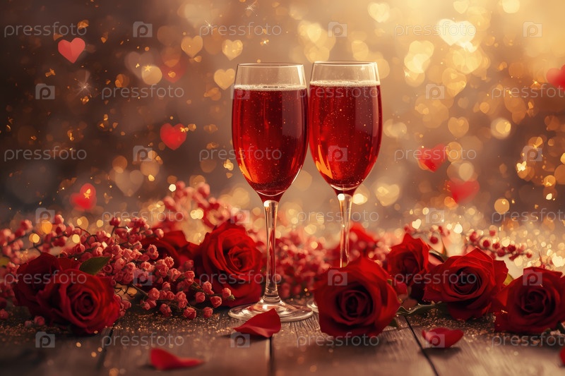 Концепция Дня Святого Валентина: два бокала красного вина, шоколад в окружении красных цветов и сердца на День святого Валентина