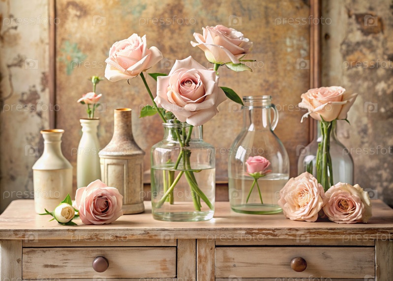 Красивые розы в стеклянных вазах и флаконах на древнем деревянном шкафчике Букет цветов в вазе в интерьере дома Светлый, бежевый, розовый цветочный фон