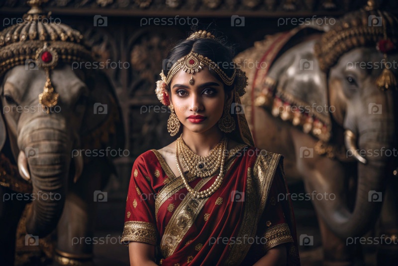 Красивая индийская девушка в традиционном национальном костюме, сари. со слонами. портрет символизирует традиции, культуру и красоту народа Индии