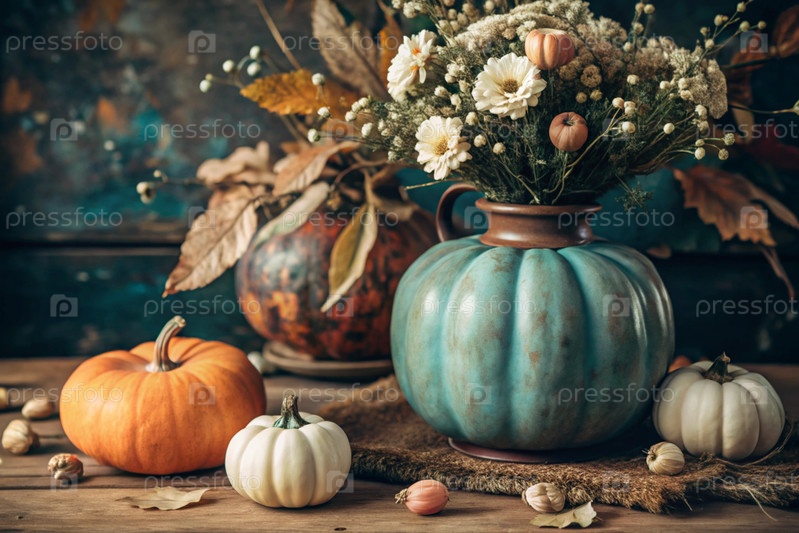 Букет цветов в керамической вазе и тыквы на деревянном столе у окна концепция домашнего комфорта осенний декор для Хэллоуина