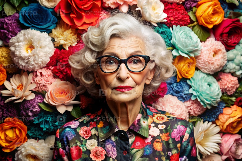 Портрет стильной, модной пожилой женщины, пенсионерки 70 лет, которая носит очки и одежду с цветочными оттисками