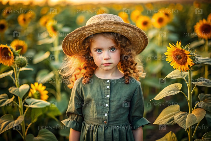 Портрет красивой кудрявой девушки в соломенной шляпе и зеленом платье на цветущем поле подсолнечника Детство