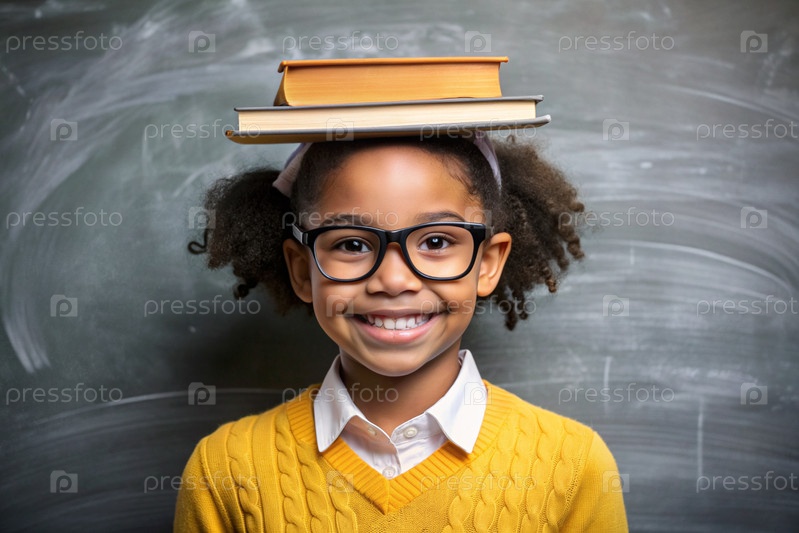 Красивая афроамериканская девушка с очками и книгами. Ребенок впервые ходит в школу. Ребёнок в классе с доской