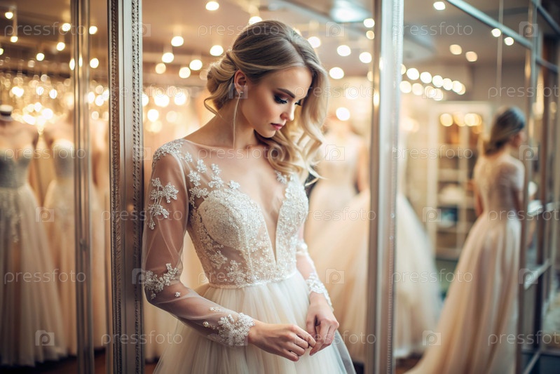 Аренда и покупка свадебных платьев для мероприятий. близко. красивая девушка Невесна пробует на себе элегантное белое свадебное платье в роскошном брачном салоне