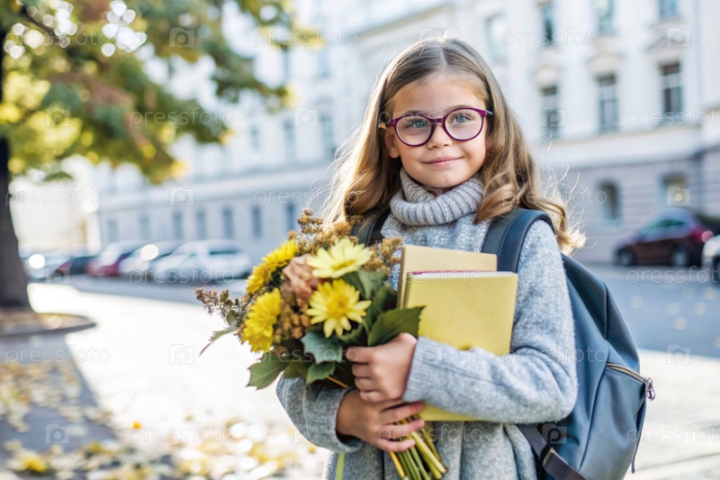Красивая девушка с очками и букетом осенних цветов впервые идет в школу. Ребенок со школьной сумкой, книгой и цветами. Малыш на городской улице