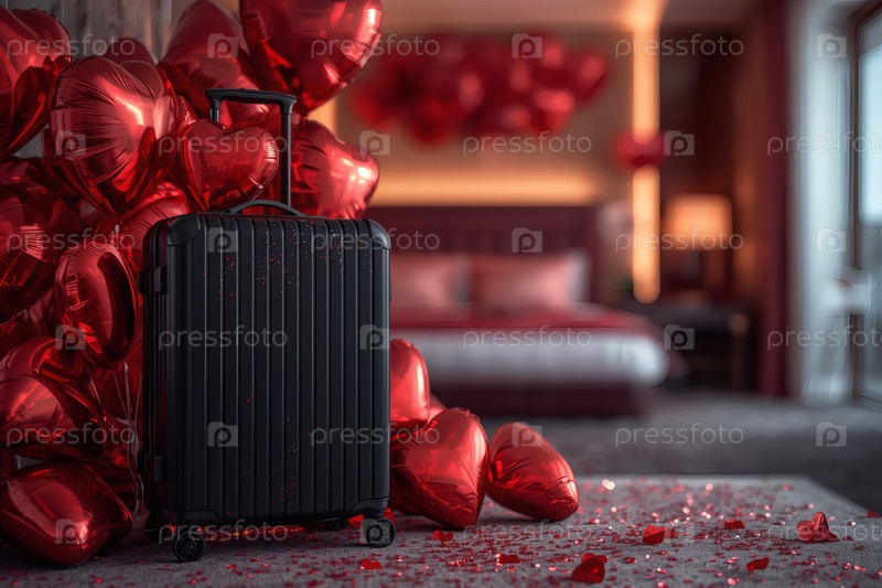 Балонный чемодан в форме сердца в гостиничном номере, чтобы отпраздновать День святого Валентина.Романтический праздник для двух любовников, действие 14 февраля