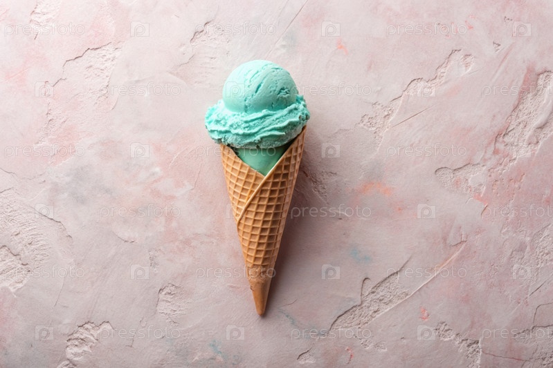 Сладкий десерт. Стильная современная концепция. Бирюзовый мороженый конус на розовом фоне. Всемирный день мороженого