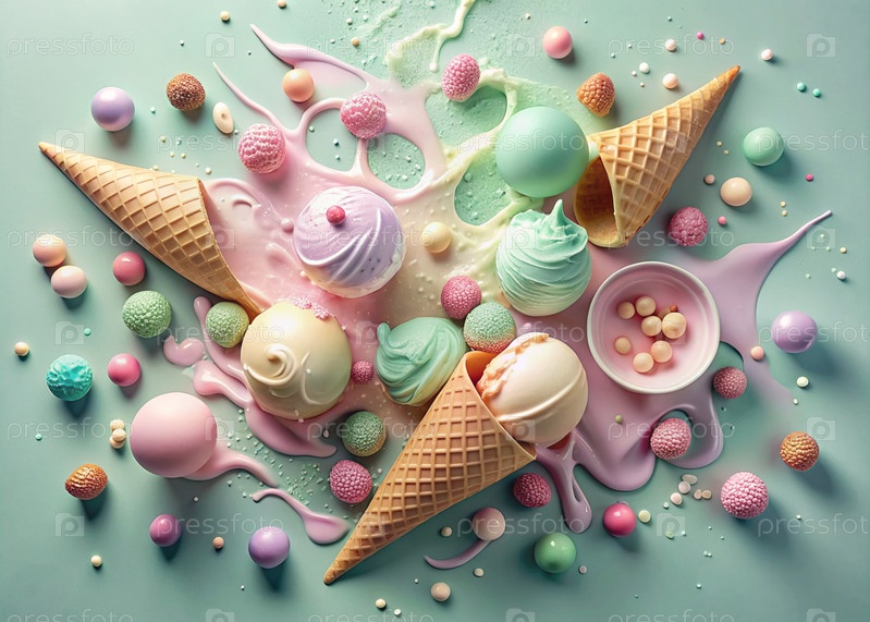 Абстрактная композиция с таяющим мороженым. Плески и брызги мороженого. натюрморт с перевернутым коном мороженого на зеленом фоне