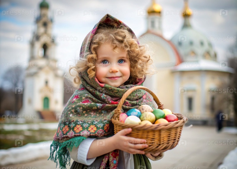 Счастливая Пасха. Христианство. Портрет трехлетней девочки в русском народном шале с плетеновой корзиной с пасхальными яйцами в руках на фоне православного храма