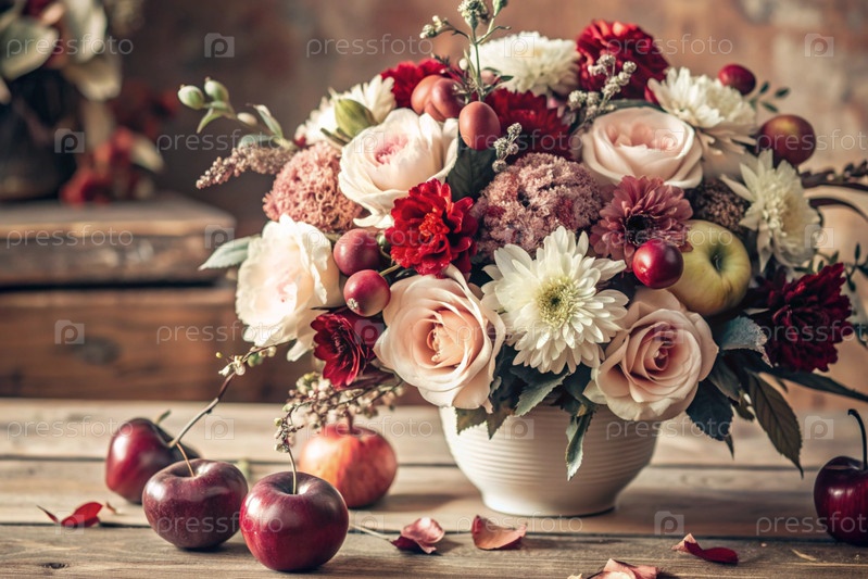 Красочное лето, осенний букет цветов различных красных, розовых, белых оттенков в вазе и спелые красные яблоки на столе