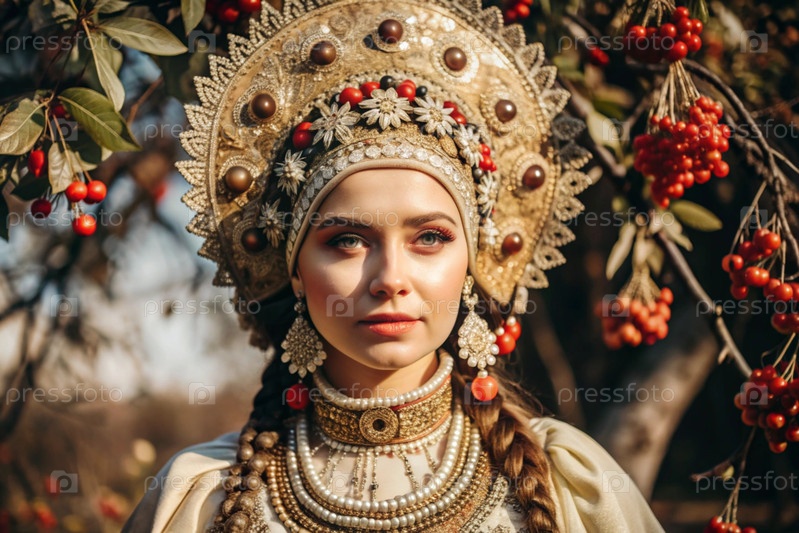 Красивая девушка в традиционном русском национальном костюме. на фоне елок. портрет символизирует традиции и красоту русского народа