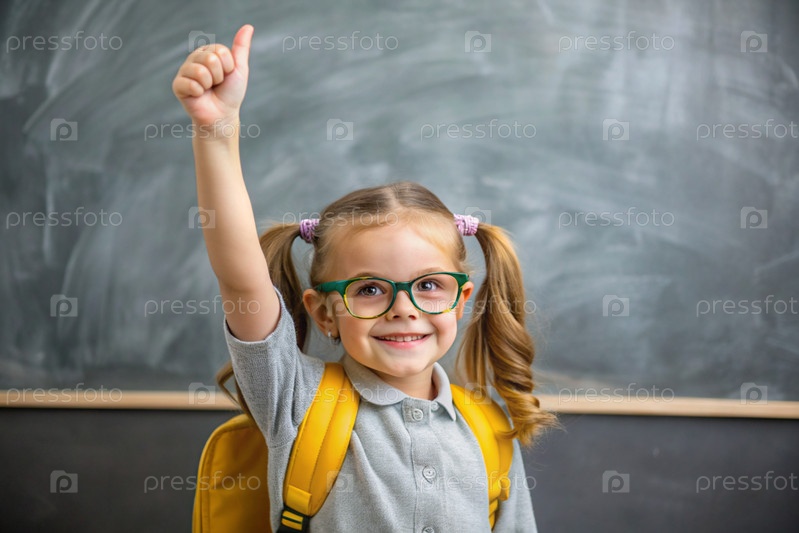 Красивая девушка в очках показывает класс своей рукой. Ребенок идет в школу впервые. Ребёнок с школьной сумкой и книгой. Ребенок в классе со доской на заднем плане. Назад в школу