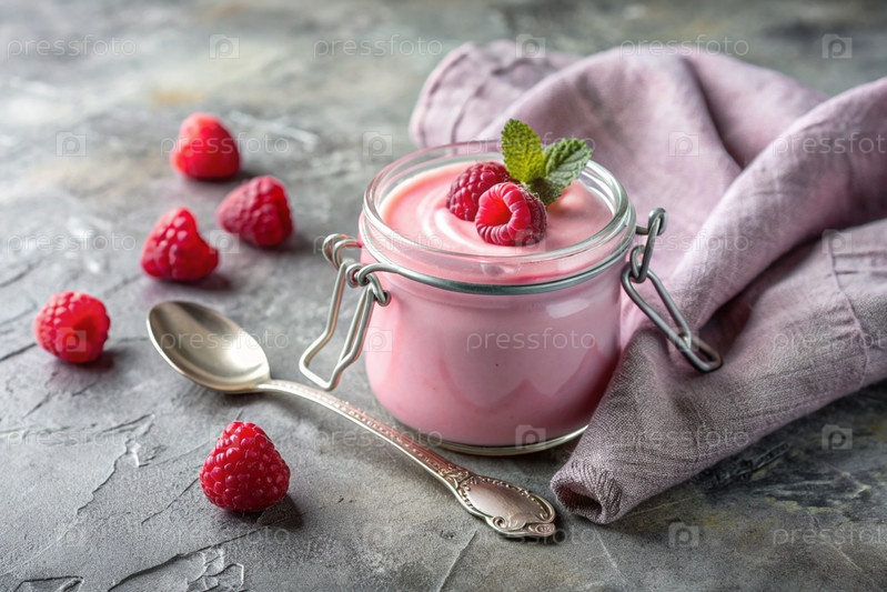 Домашний малиновый йогурт со свежими малинами, винтажной ложкой и полотенцем на стильном сером фоне