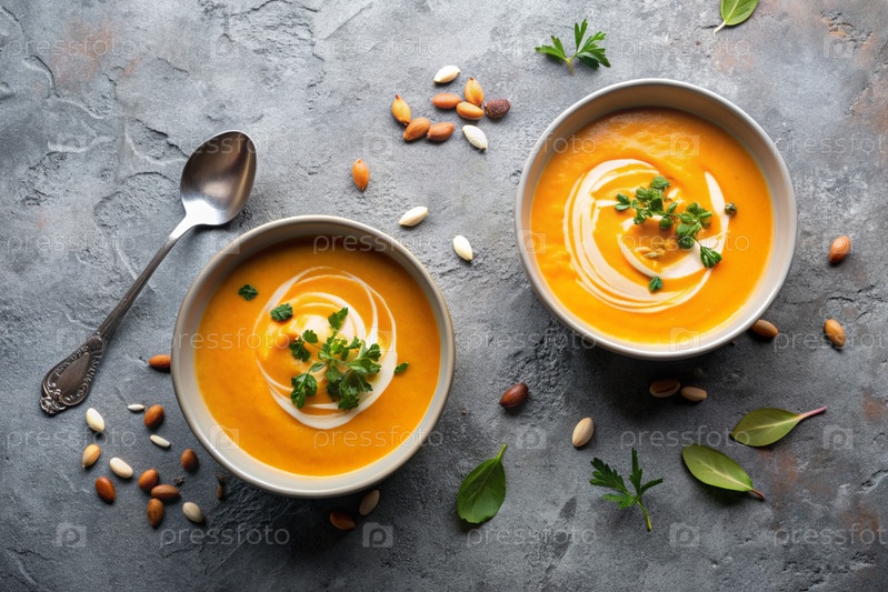 Традиционный мягкий тыквенный кремовый суп с сливками и семьями тыквы на сером бетонном фоне