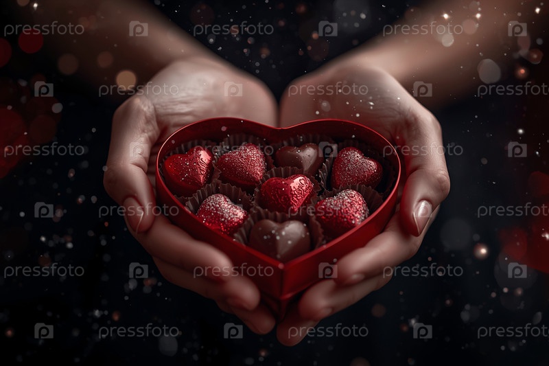Руки женщины с подарком в форме сердца с шоколадом на День святого Валентина