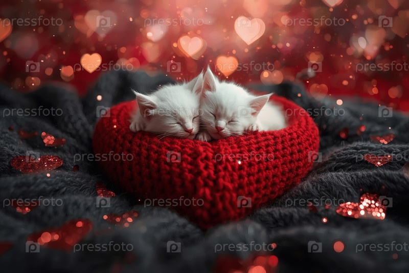 Концепция Дня святого Валентина. красное вязаное сердце и два белых котенка. открытка с котятами на вязанном одеяле