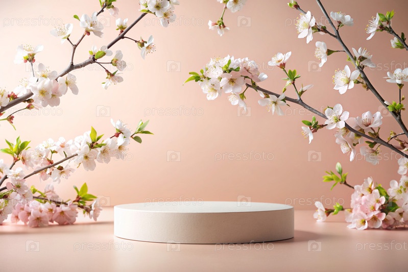 Минималистский розовый пастельный фон для демонстрации продукта.Современная подиум с розовой стеной и вишневым цветом вокруг.Креативный дизайн презентации продукции