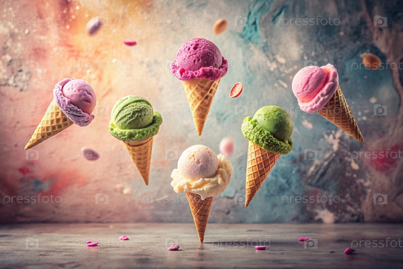 сладкий десерт. морозильные шишки с различными вкусами на бетонном сером фоне. Всемирный день мороженого
