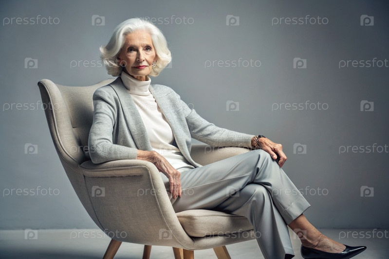 Минимализм.Студийный портрет стильной, элегантной пожилой женщины, 70-летнего пенсионера в интерьере и одежде спокойных тонов.Концепция пожилых людей