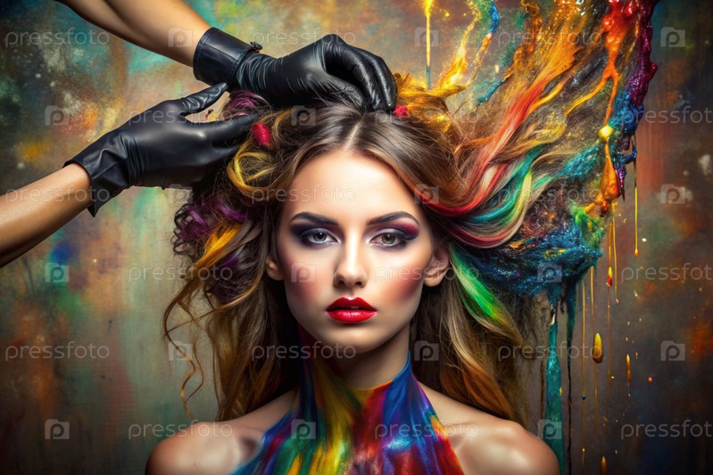Творческий баннер для салона красоты или парикмахера. Модное профессиональное окрашивание волос. Красивая женщина с длинными многоцветными волосами. Взрыв цветов на голове