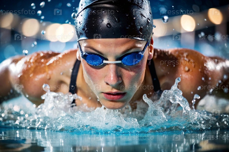 Спортивное плавание. Женское плавание. Спортсменка, которая носит очки для плавания в бассейне во время соревнований на близком расстоянии. Женщина смотрит прямо в камеру