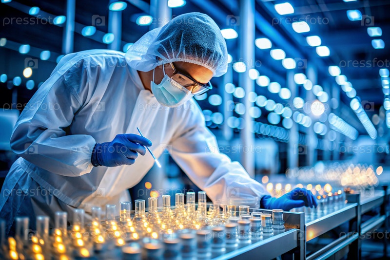 Производство лекарств: фармацевт тестирует медицинские флаконы на автоматическом трубопроводе фармацевтической производственной линии с использованием искусственного интеллекта