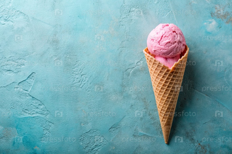 Сладкий десерт. Стильная современная концепция. Розовый мороженый конус на ярком бирюзовом фоне. Всемирный день мороженого