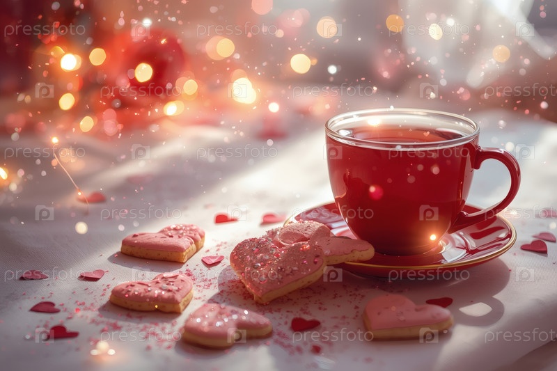 Домашнее имбирное печенье в форме сердца и чашка чая на столе. вкусный имбирный кекс в форме сердца на светло-розовом фоне. свежевыпеченный имбирный кекс на День святого Валентина