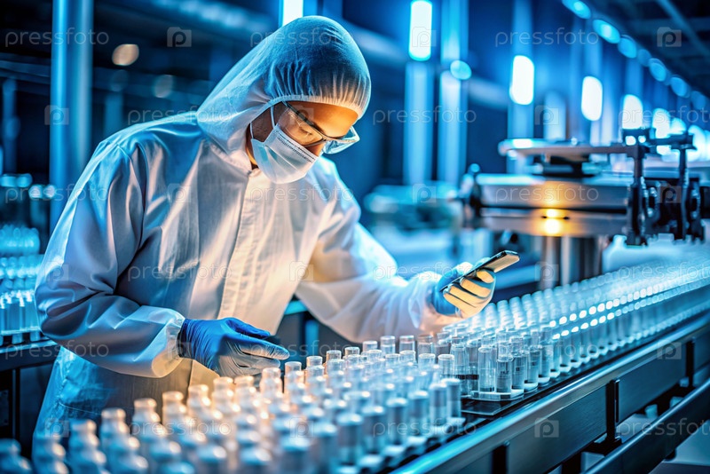 Производство лекарств: фармацевт тестирует медицинские флаконы на автоматическом трубопроводе фармацевтической производственной линии с использованием искусственного интеллекта