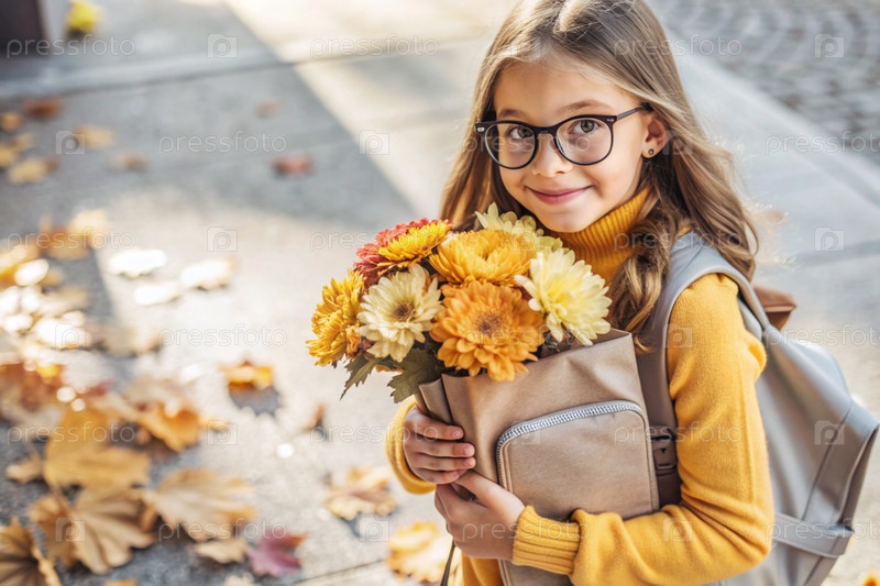 Красивая девушка с очками и букетом осенних цветов впервые идет в школу. Ребенок со школьной сумкой, книгой и цветами. Малыш на городской улице