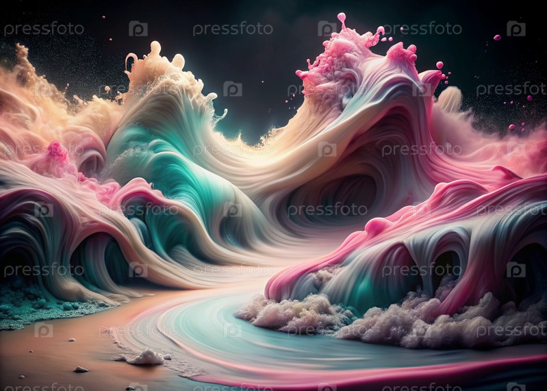 Абстрактный, мечтательный акварельный фон с волнами, полосами и жидкими потоками розового, синего и жемчуга