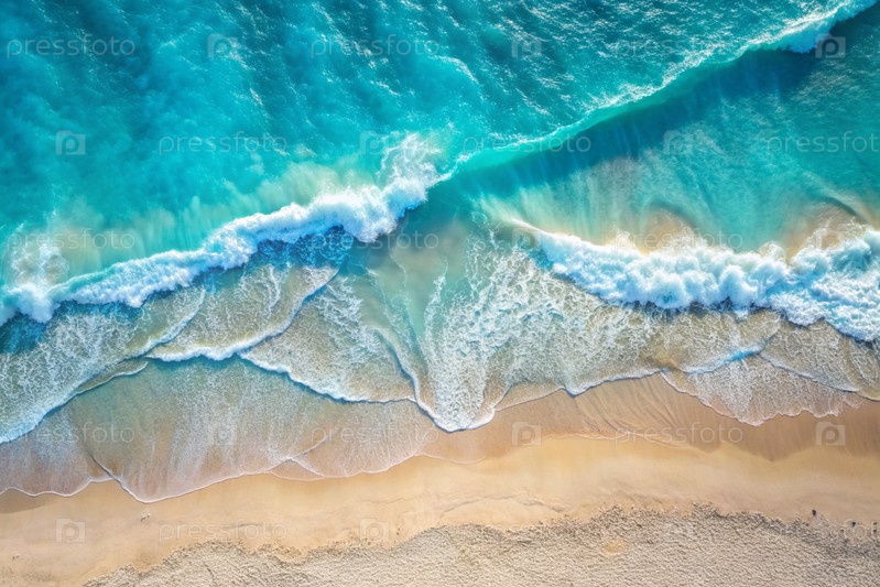 Концепция отдыха и путешествий. Красивый фон. Вид сверху на белый песчаный пляж и пенообразная волна бирюзового океана