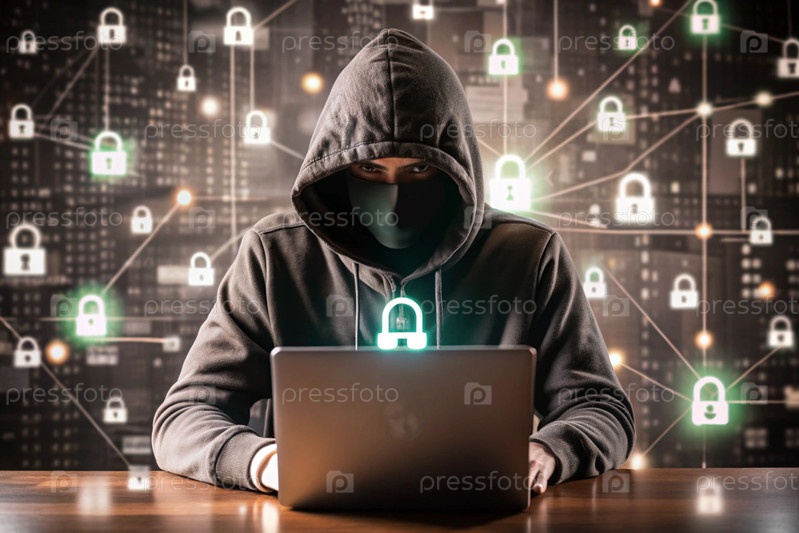 Хакер работает на ноутбуке, цифровые коды на виртуальном фоне. взлом и защита онлайн-данных. цифровые технологии, разработка программного обеспечения
