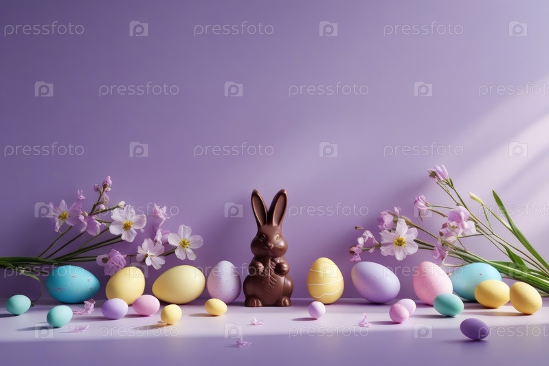 Счастливая Пасха 2026, минималистическое студийное фото. Шоколадный пасхальный кролик, пасхальные яйца и нежные весенние цветы. Мягкое освещение студии создает ощущение чистоты и воздушности