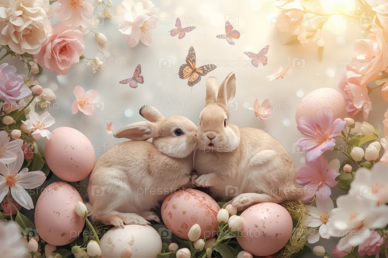 Пасхальные кролики лежат на пасхальных яйцах и смотрят в камеру