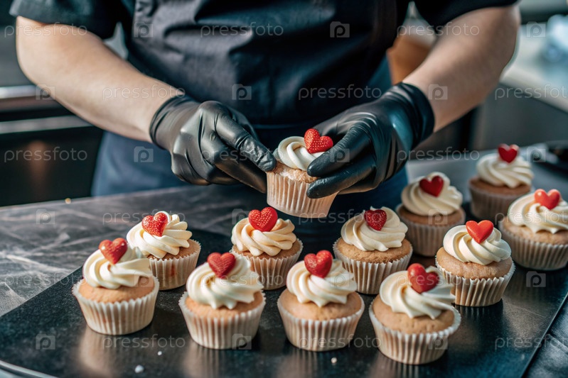 Профессиональный кондитер в черных перчатках украшает кексы сливочными и красными сердцами