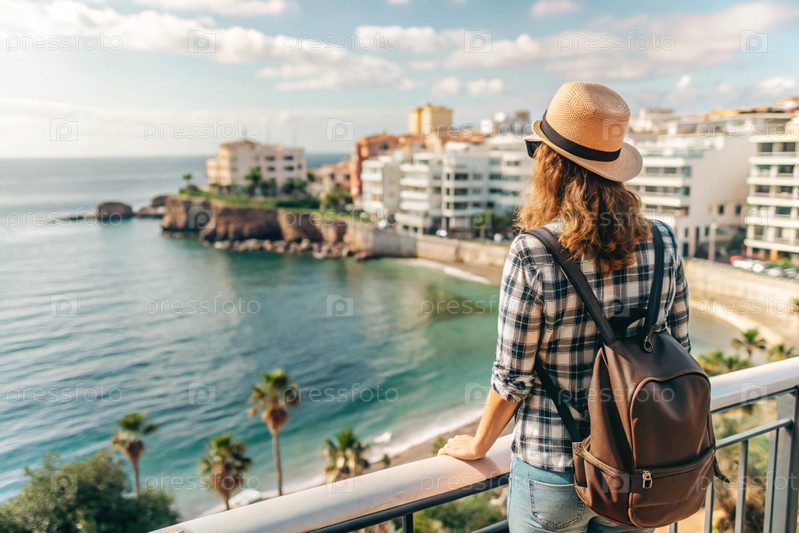 Девушка-путешественница с рюкзаком на фоне южного побережья моря. она путешествует и наслаждается жизнью и окружающей средой. туризм