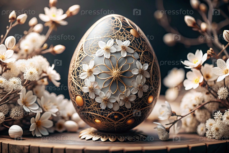 Пасхальный баннер. Концепция яркого пасхального праздника. Необычное деликатное пасхальное яйцо с нежными белыми цветами