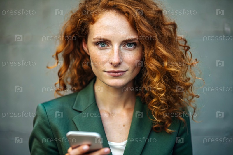 Деловая женщина с локонами красных волос и веснушками. Она одета в обычное зеленое пиджак. В руках смартфон. Небольшой бизнесмен смотрит на свой мобильный телефон