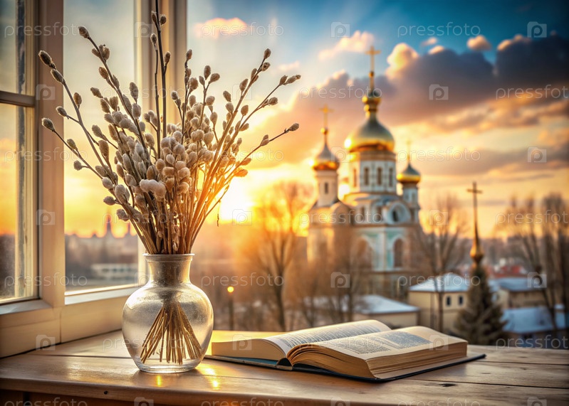 Большой план букета ивы в стеклянной вазе и книги Библии напротив старого белого окна с видом на золотые куполы храма и заходящее солнце