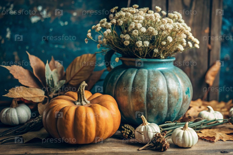 Букет цветов в керамической вазе и тыквы на деревянном столе у окна концепция домашнего комфорта осенний декор для Хэллоуина