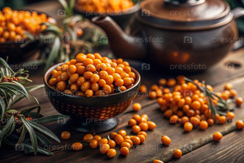 Здоровая, спелая ягода морского гречневого терна в ближайшем плане.Витамин, оранжевый, осенний, сезонный чай из ягод морского гречневого терна на темном фоне.Яблочный чай для иммунной системы