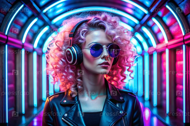 Молодая красивая девушка в солнцезащитных очках слушает музыку на больших беспроводных наушниках, стоя в неонном туннеле среди неоновых вывесок
