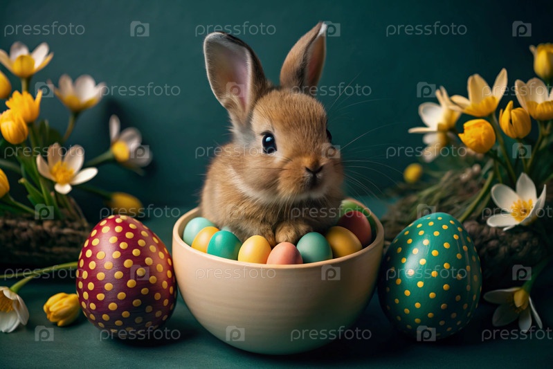 Известный праздник. милый пасхальный кролик заглядывает из пасхального яйца и разноцветные яйца разбросаны вокруг. концепция счастливой Пасхи