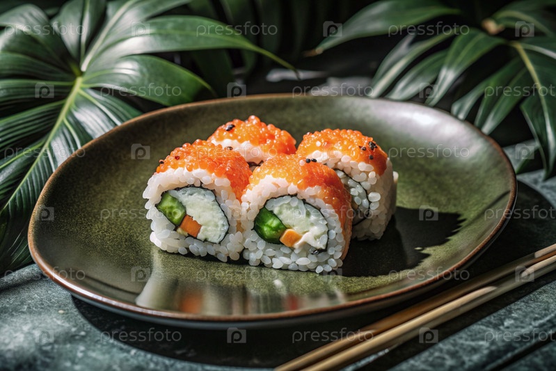 Японская еда. Суши-роллы Калифорния, Филадельфия с угорьем, красной икры и лососем. Концепция меню суши-бара