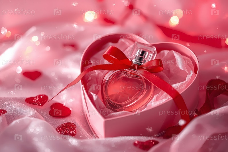Элегантная бутылка женского парфюма в мягкой розовой подарочной коробке, украшенной красной лентой и сердцами