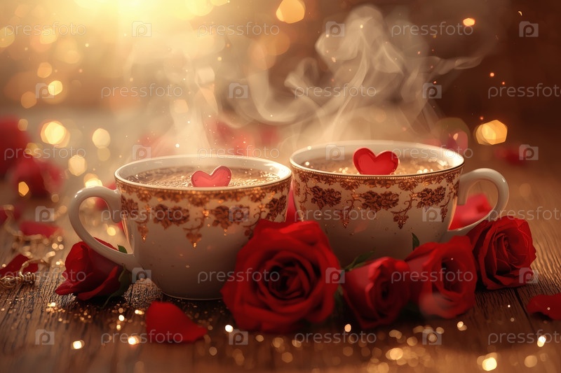 Чашки горячего кофе или чая, окруженные красными цветами и сердцами в День святого Валентина