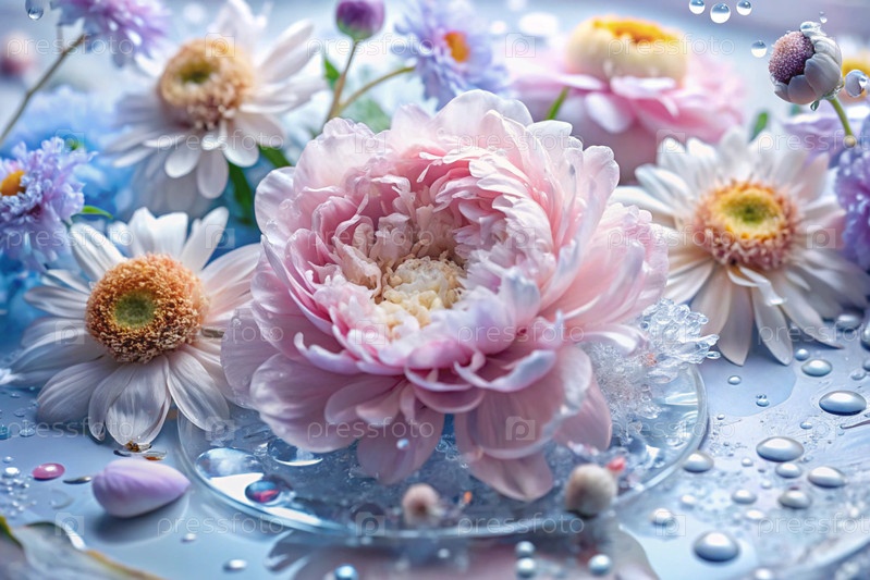 Красивый, воздушный, деликатный цветочный фон в синих и розовых тонах. цветы пиона, хризантемы, ромашки с каплями воды на лепестках
