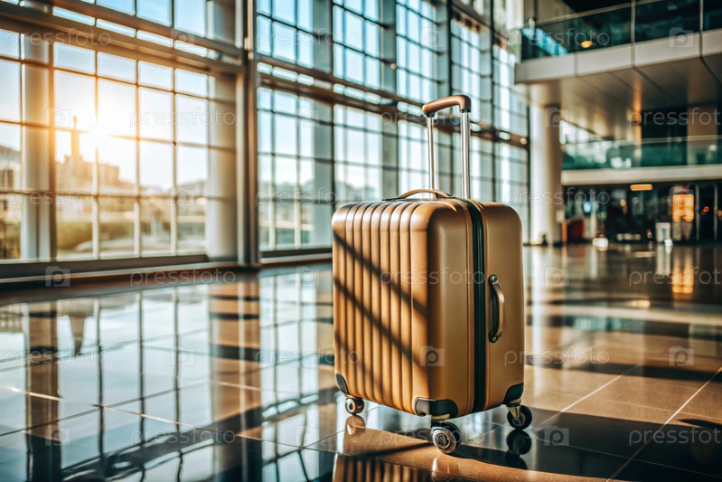 Чемодан в пустом аэропортовом салоне, сумки для путешествий в терминале вылета, концепция летнего отдыха, пространство для текста или дизайна